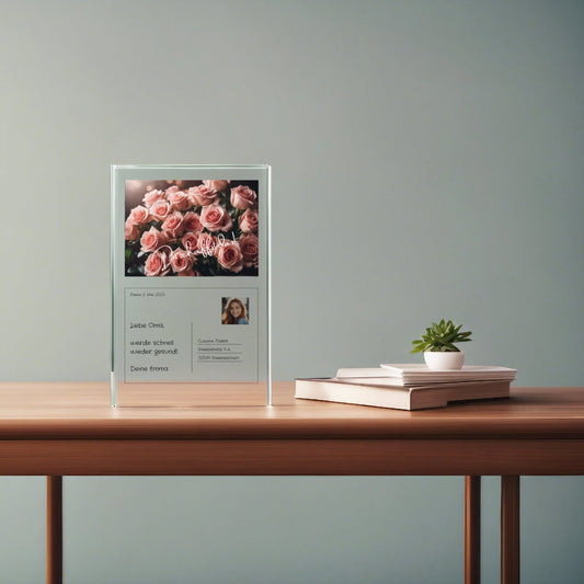 Unsere Genesungswünsche auf Acryl sind nicht nur Ausdruck von Wärme und Mitgefühl, sondern auch wahre Unikate. Du hast die Möglichkeit, Bilder und Texte nach deinen Vorstellungen zu personalisieren. Wähle aus einer Vielzahl von Designs, die von zarten Blumenarrangements bis hin zu motivierenden Sprüchen reichen.